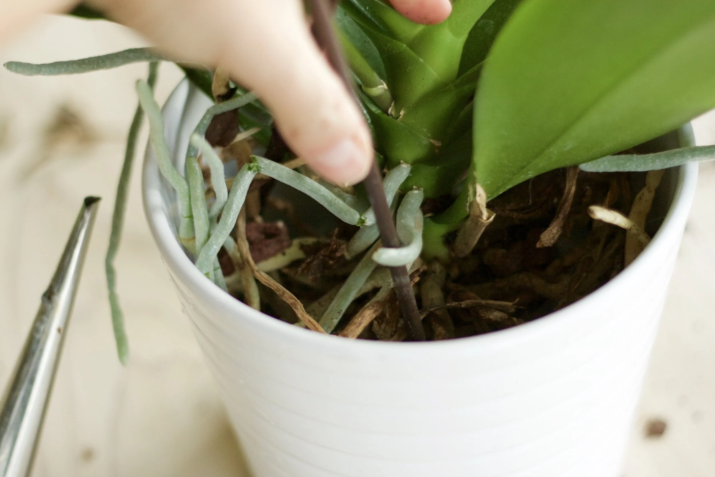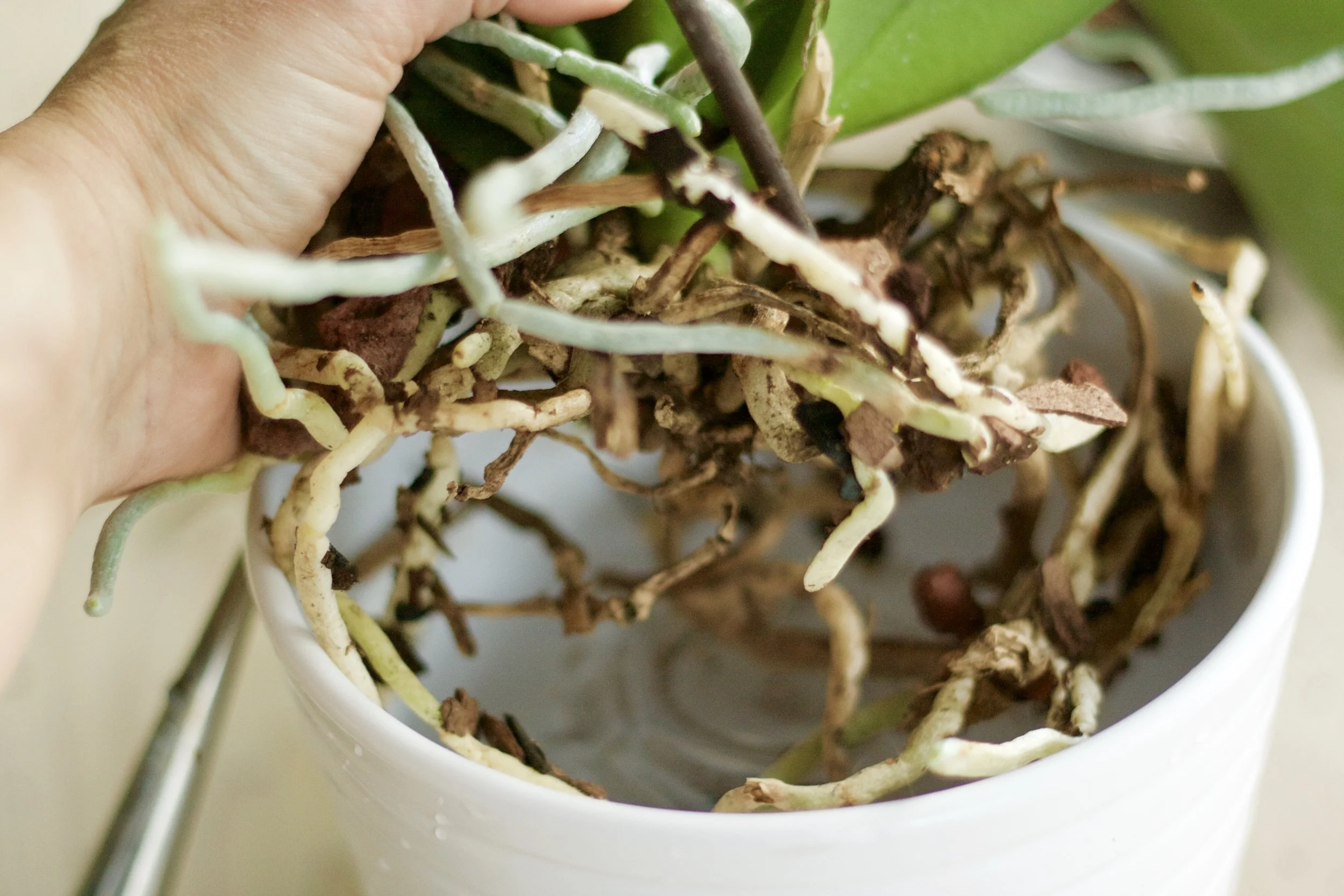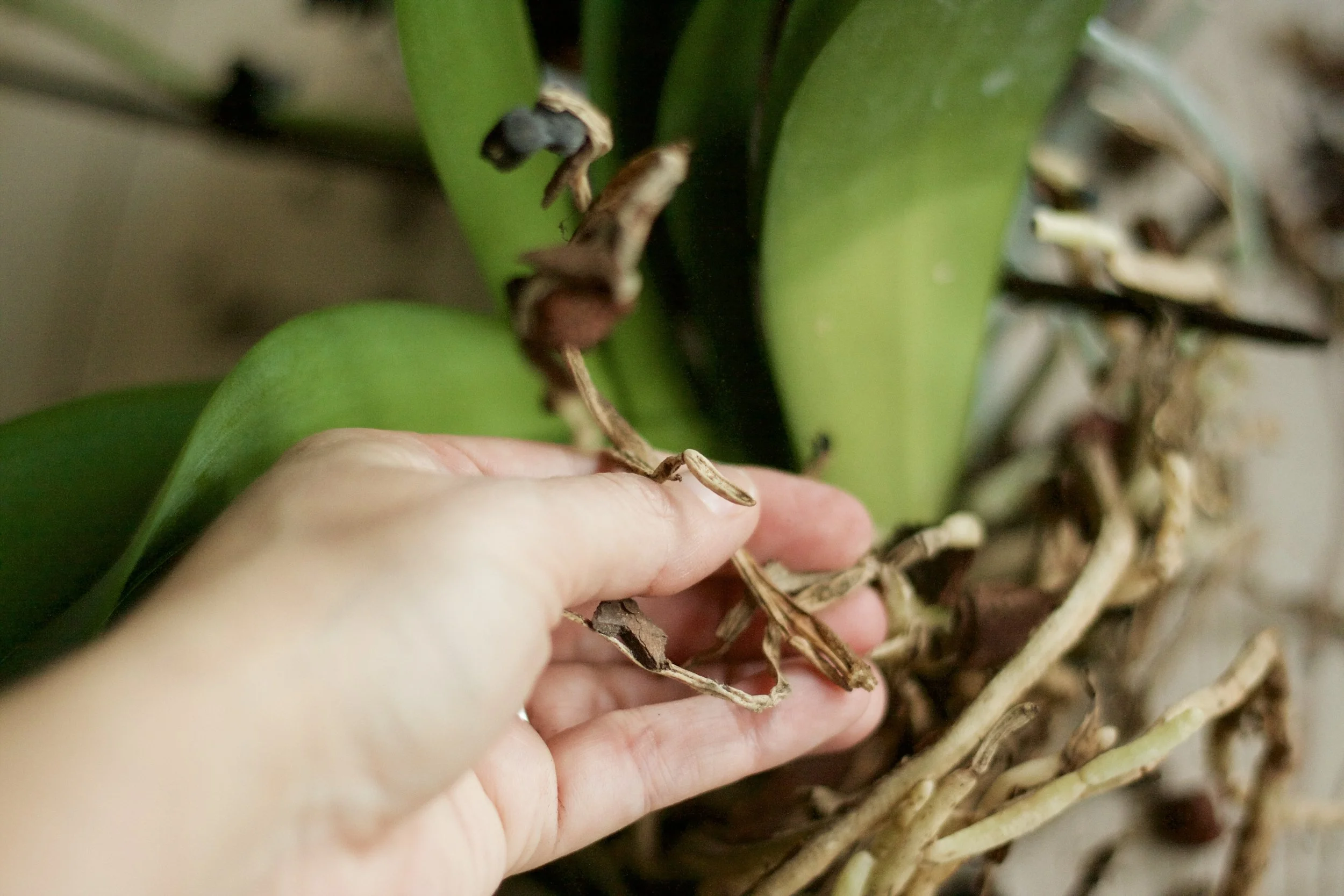 Step 4: If your orchid has dead dried roots cut them off so the new growth has room. Also many are transported with a peat moss ball up at the base of the roots close to the leaves. This has to be removed as it is just to be a short temporary water source in transportation. If not removed the roots will rot.