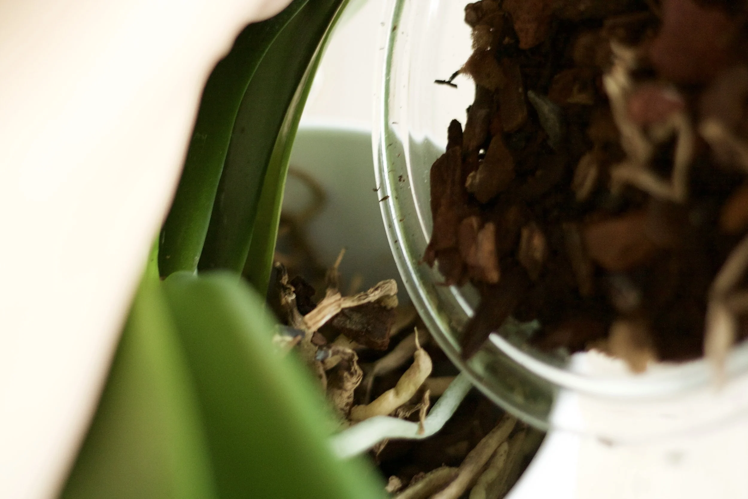 Step 2: Orchids do not like to be in soil. Many places that sell you orchids will ship them in soil to help last until the destination. Please, buy a bark/charcoal orchid mix. The roots need to breath and stay away from too much moisture.