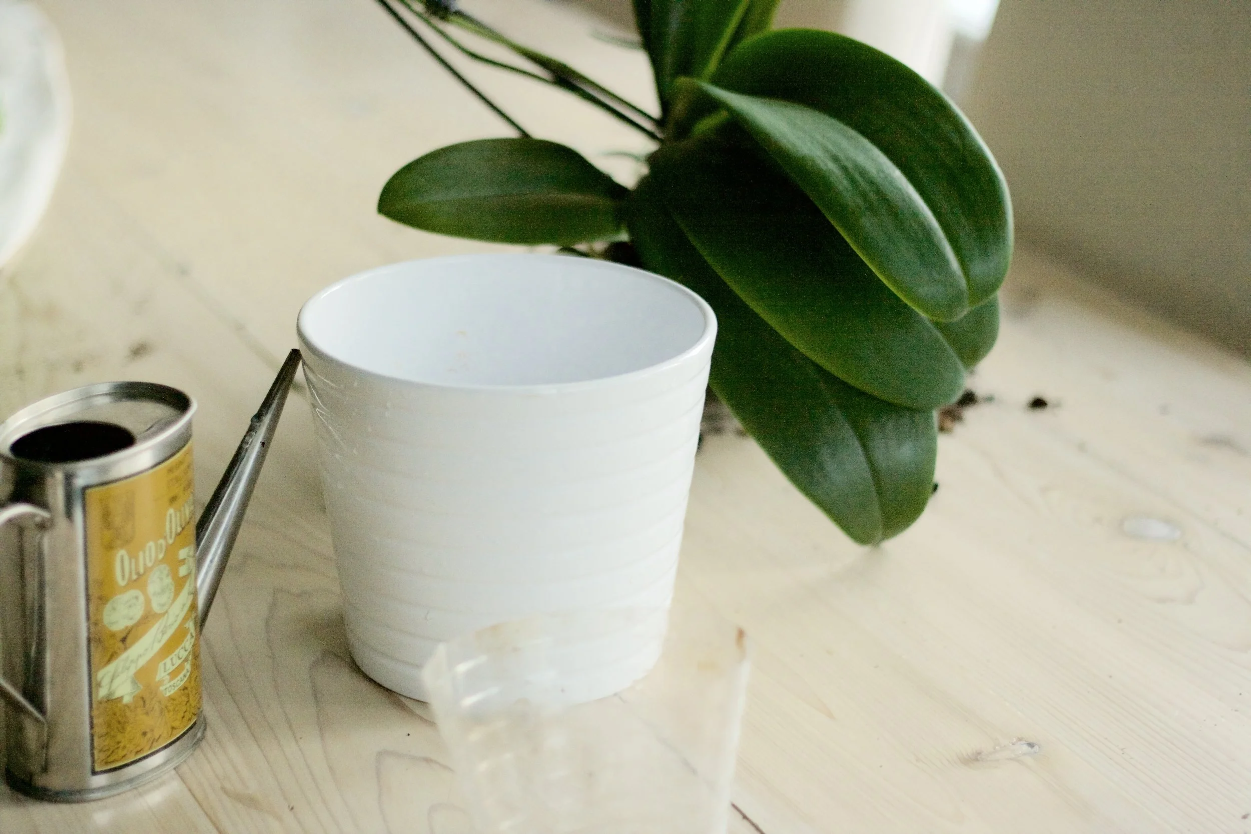 Step 1: You need a ceramic pot, plastic cup, watering can and a bark/charcoal orchid mix (buy at local greenhouse, online or at Target this is our favorite mix)